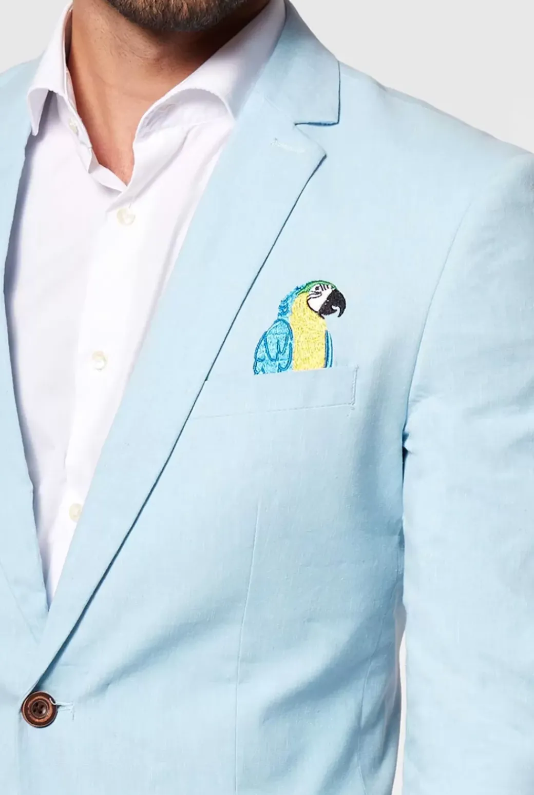 A Bird In Your Chest Pocket Is Worth Two In The Bush. Spring And Summer Are The Seasons To Show Your Vivid Style Choices. This Soft Blue Blazer Is Made Of A Breezy, High-Quality Cotton-Linen Blend And Therefore Perfect To Keep You Cool While Maintaining A Sharp Look. Topped Off With Eye-Catching Embroidered Parrots And A Palm Leaves Lining, This Jacket Has It All: Fun, Luxury And Style.