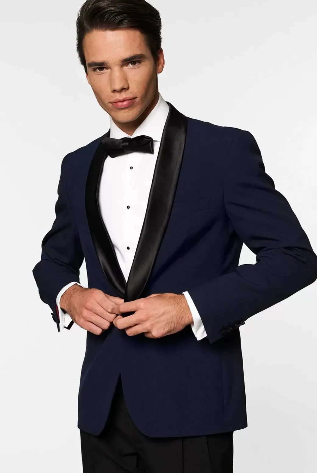 Blue Is The New Black When It Comes To Formal Wear. The Color Stands For Royalty, Confidence And Loyalty And Is Livelier Than A Traditional Black Tuxedo (That Everyone Will Be Wearing). So Why Not Take Advantage Of The Opportunity To Stand Out From The Crowd And Sport A Blue Tuxedo With A Satin Shawl Lapel, A Double-Pleated Pants And A Bow-Tie On Your Next Formal Occasion?
