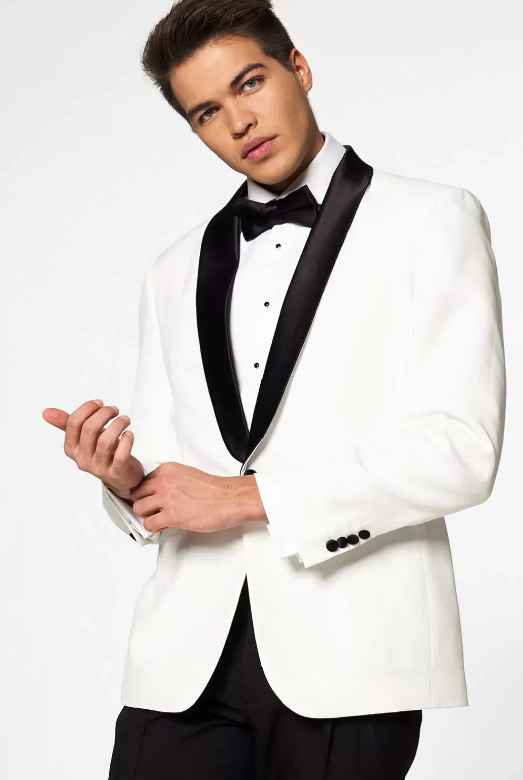 An Off-White Dinner Jacket Paired With Double-Pleated Black Tuxedo Pants And A Bow Tie Is One Of The Most Elegant Options When It Comes To Formal Wear, And Makes You Stand Out In Style. It’s Sure To Work Well For Black Tie Events, As Well As Formal Daytime Events And Summerly Formal Occasions. The Pearly White Tuxedo Features A Satin Shawl Lapel And Has Been Manufactured To Have A Stylish And Modern Fit.