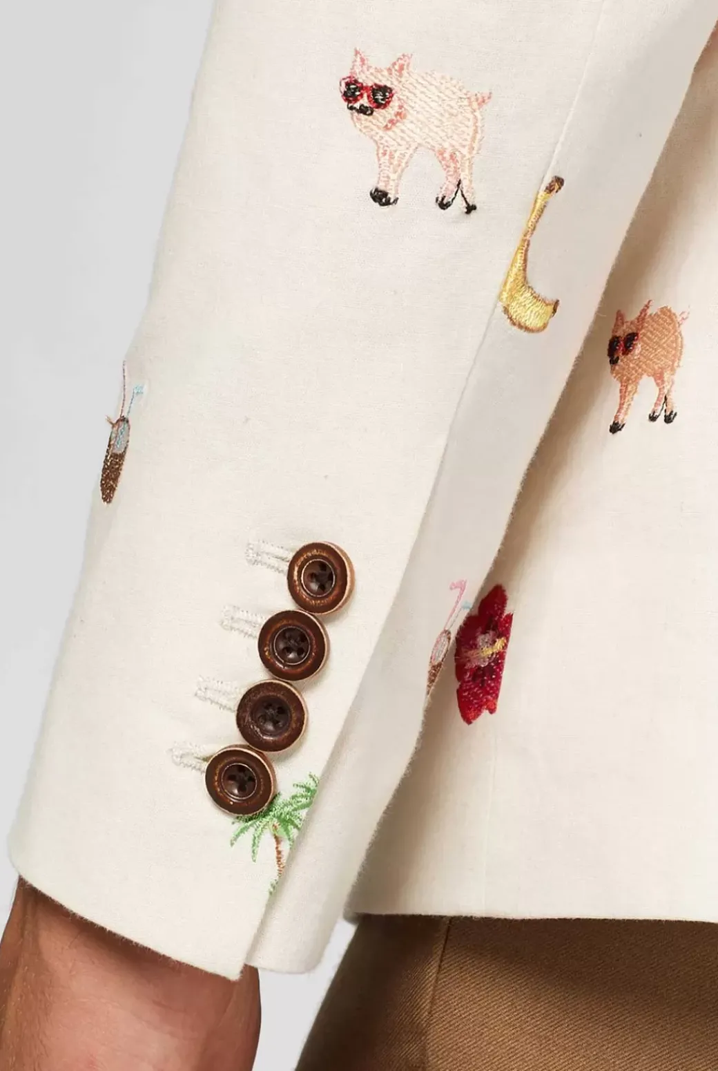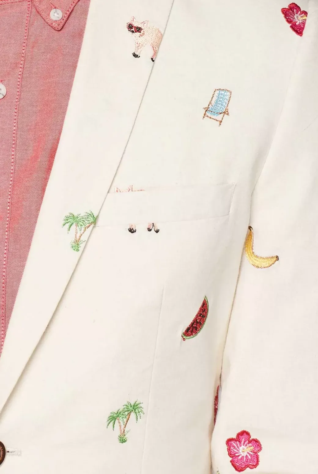 This Off-White Opposuits Deluxe Blazer Is Designed To Make You Feel Comfortable From The Beach To The Bar, From The Office To A Wedding And All Places In Between. Made Of A Lightweight Cotton-Linen Mix, Finished With All-Over Tropical Embroideries, This Blazer Lends A Breezy And Subtle Humorous Touch To Your Formal Look.