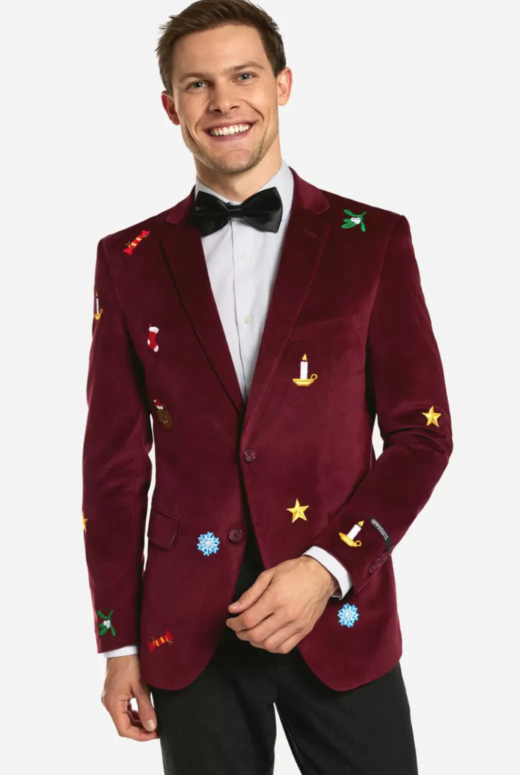 The Right Christmas Outfit Can Really Elevate Your Holiday Cheer. Designed With A Soft, Rich Velvet Fabric And A Slim Fit, This Opposuits Deluxe Blazer Instantly Upgrades Your High Style Christmas Look. It’s A Smooth Burgundy Blazer Embroidered With Christmas Icons, Which Will Make You Win At Every Christmas Party.